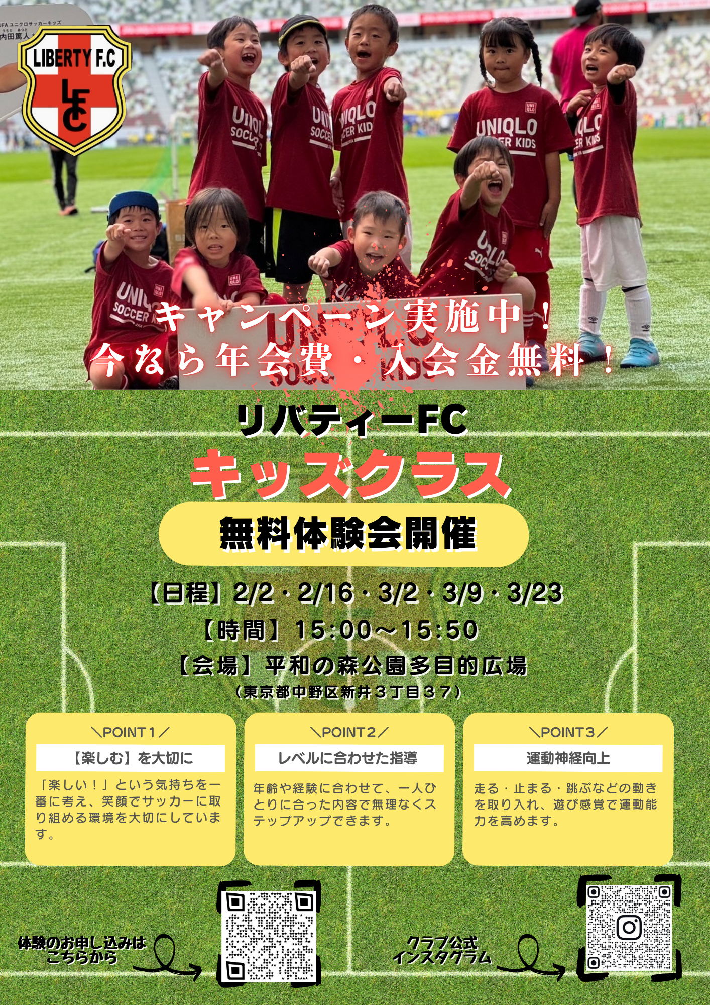 キッズサッカー体験会のお知らせ 2026年1月30日 お知らせ この度、リバティーFCではキッズクラスの無料体験会を開催いたします‼️ ☑️初心者大歓迎📣☑️楽しくサッカー⚽️☑️運動神経向上🏃♂️ 同時にキャンペーンも実施しております📣今なら年会費・入会金無料‼️ 【体験会日程】 2/2(月)・2/16(月)・3/2(月)・3/9(月)・3/23(月) 体験の申し込みはこちらから たくさんのご応募お待ちしております! URL Copied!