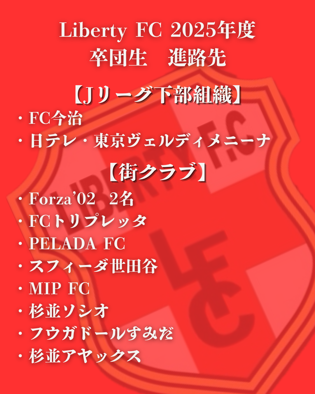 NEXT STAGEへ 2026年2月9日 お知らせ T2に昇格してくれた彼らクラブのために戦い抜いた彼ら リバティーで育ち、次の舞台へ 積み重ねた日々が、未来になる次は、君の番 ジュニアユースチーム関係者の皆様、どうぞよろしくお願いいたします URL Copied!